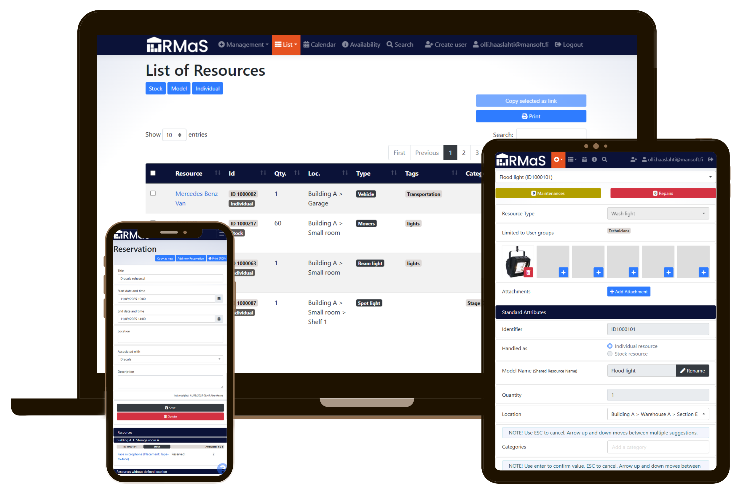 ARMAS works as a standalone solution, but when connected to Theatron, it becomes even more powerful. With seamless automatic integration, you can link reservations, maintenance tasks and repairs directly to your productions and view them instantly within Theatron’s interface. If you have other planning tools, we can also integrate it.