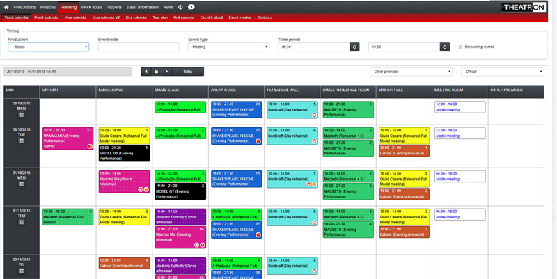 È possibile gestire tutti gli eventi che avvengono, performance, prove, meeting, spettacoli in visita, lezioni, affitti di stanze e così via. Theatron rende anche possibile pianificare i vostri tour come meglio preferite e lo stesso vale per i programmi delle prove. Sono per esempio disponibili calendari giornalieri, settimanali, mensili, annuali oppure appositamente dedicati ai tour, dipartimenti, ferie e festività e per la gestione delle prenotazioni. Tutti i calendari sono connessi e utilizzano lo stesso calendario centrale, ma differenti e separate visualizzazioni permettono una gestione più efficiente e pratica delle varie informazioni.