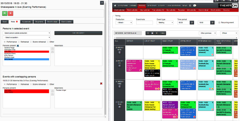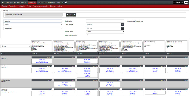 Per ogni produzione si possono facilmente creare e gestire ruoli e cast. Possono essere programmati per gli attori orari di preparazione prima e dopo lo spettacolo cosi come è possibile creare programmi dettagliati delle prove Theatron, controlla automaticamente che non avvengano sovrapposizioni nello staff. Per modifiche tardive degli orari Theatron può inviare automaticamente un allarme SMS al personale artistico che notifica il cambiamento.